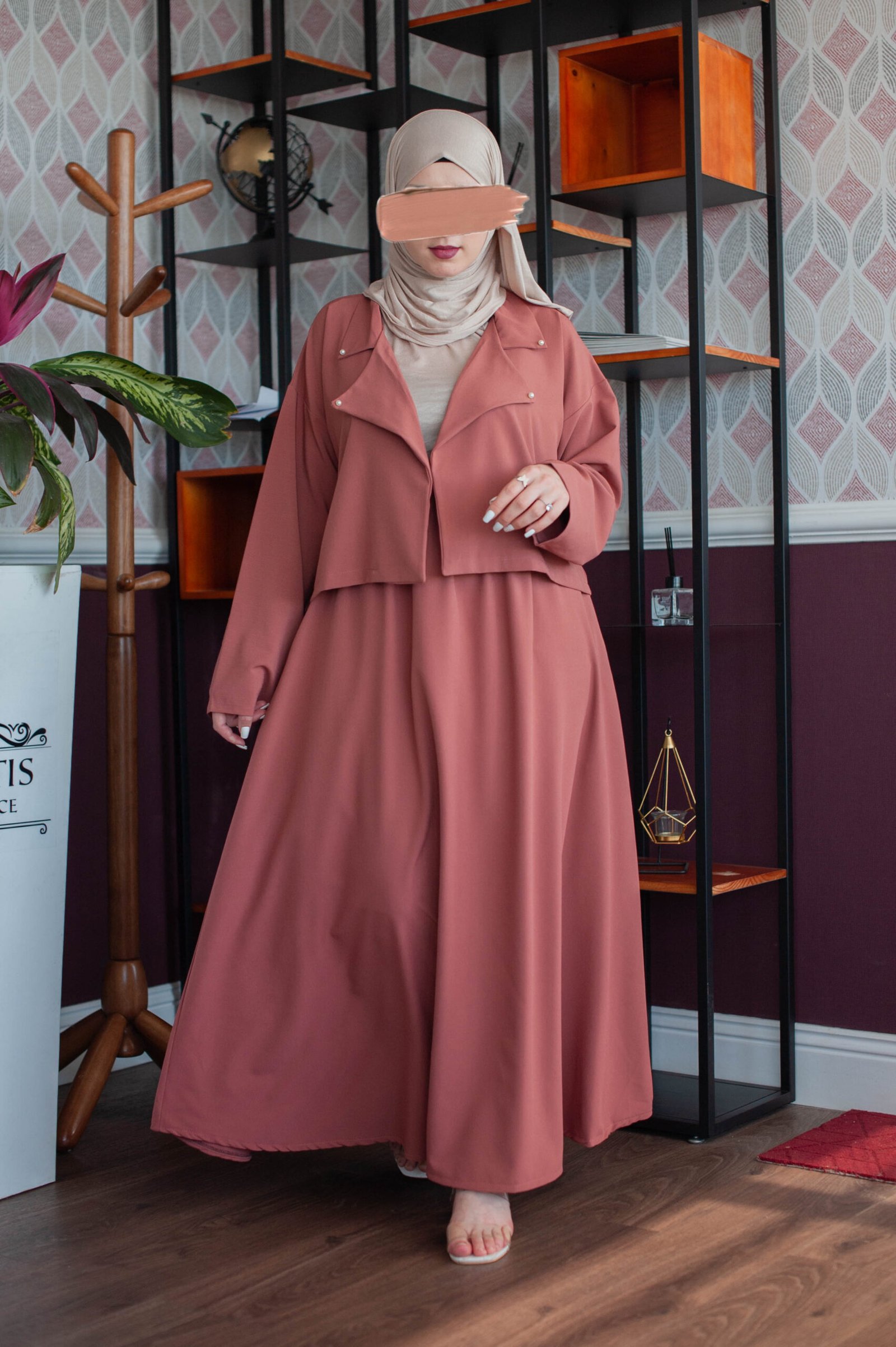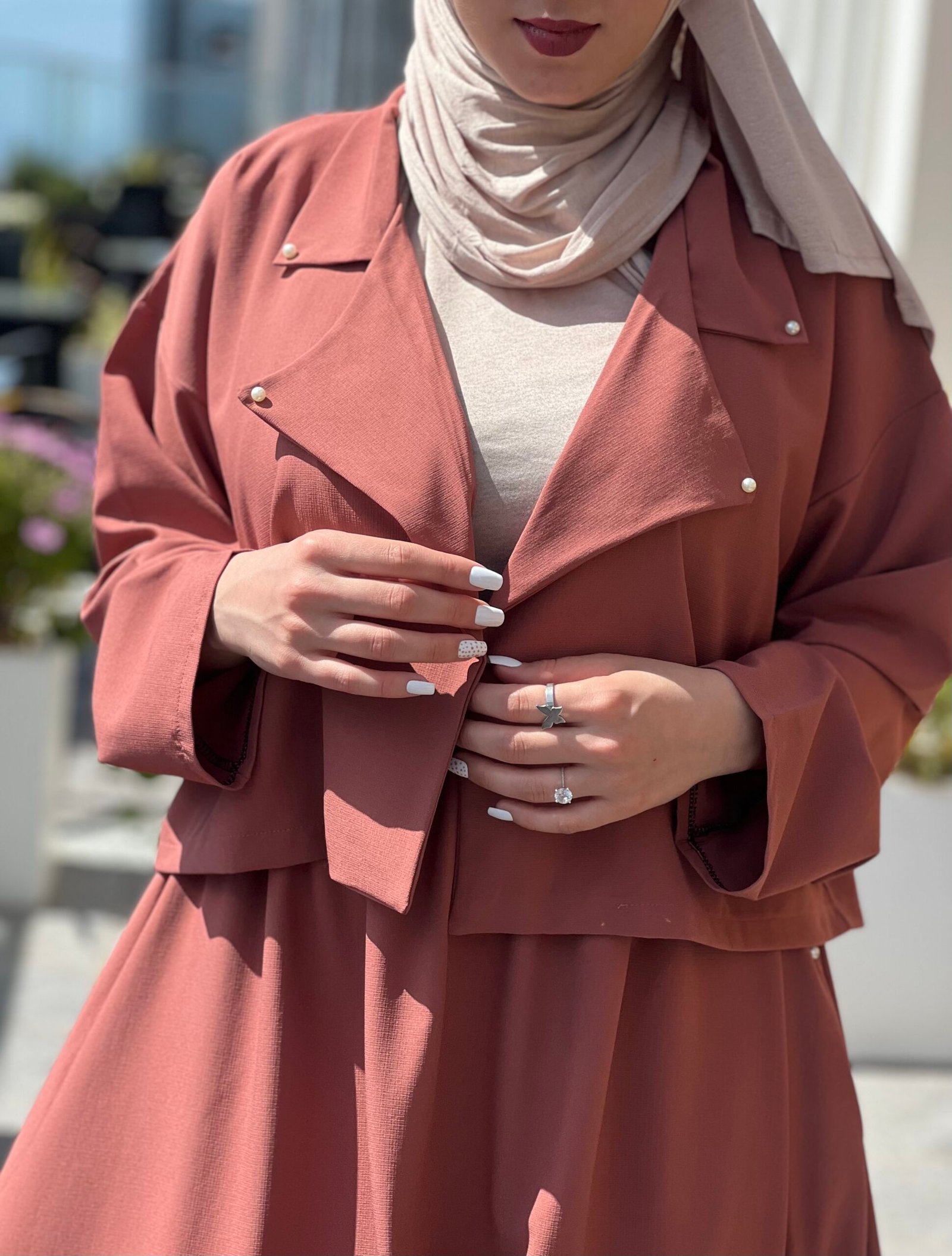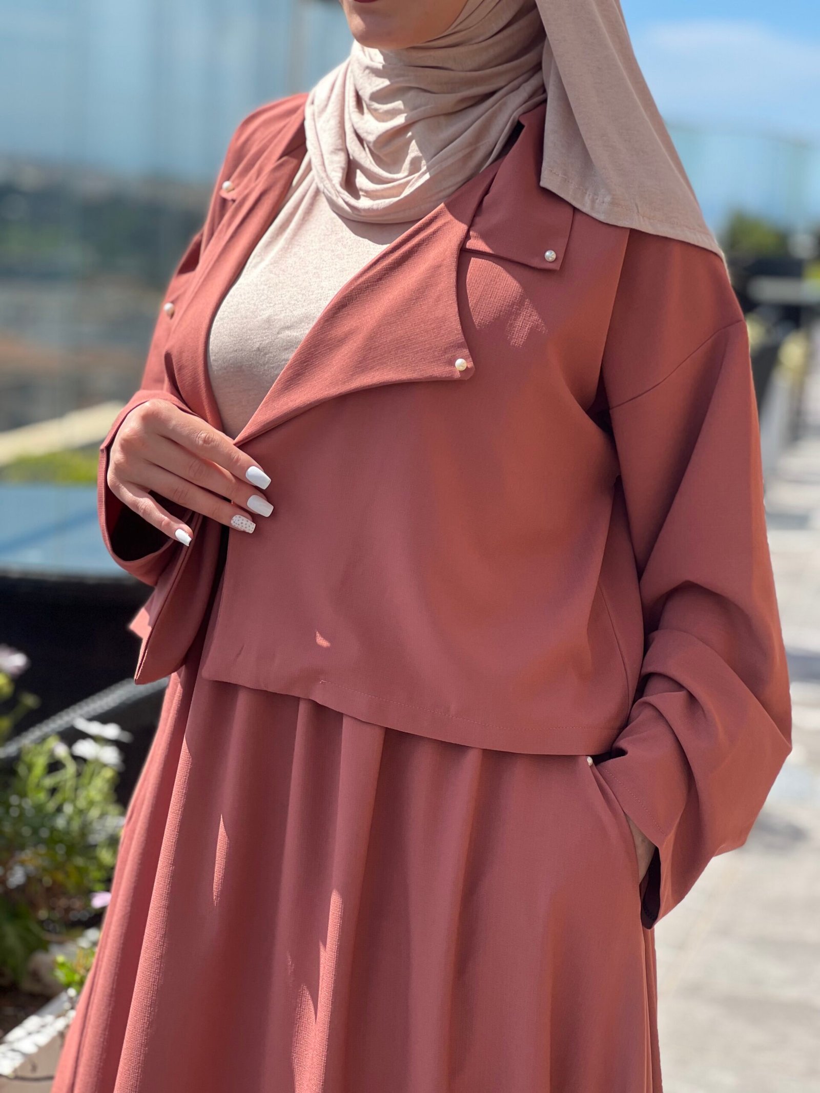 Ensemble disa brique disponible composé d’une jupe évasée avec sa veste classique courte.
